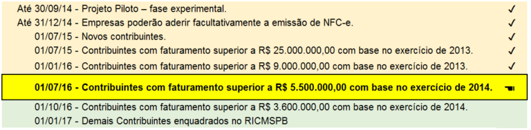 - Os estabelecimentos com faturamento anual superior a R$ 3,6 milhões, no ano de 2014, deverão emitir a NFC-e a partir de outubro deste ano em vez de janeiro de 2017.